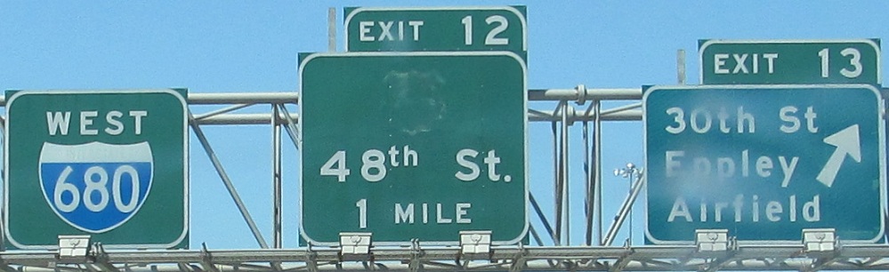I-680 NB/EB (the direction changes when the road curves around Exit 6), starting at an extra-wide shield and running through button copy and non-reflective background signage up to the last exit in Nebraska.