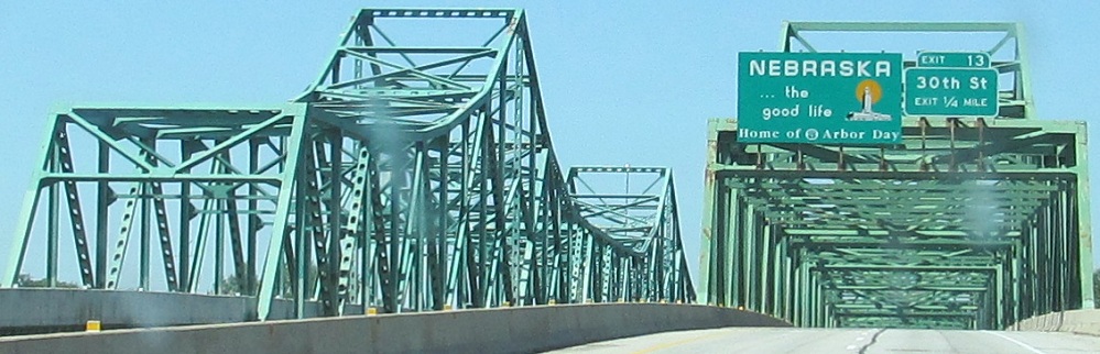 I-80 isn't the only way into Nebraska to inform you about the good life. Bask in the good life being enjoyed by these truss bridges. The EB one (second photo) is the original 1952 Mormon Bridge, named for the trail that went this way and of course predating the freeway.