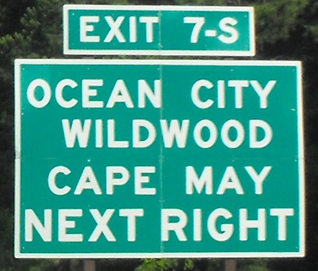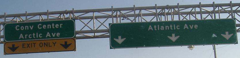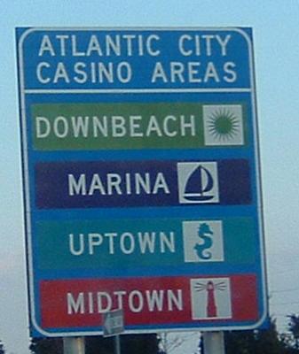 Amazingly square eastbound signage, with a stubborn refusal to use lowercase letters, a single font size, or a normal-looking arrow. It's all well and good that AC tries to separate visitors by area (with a list of casinos by area after that initial sign), but if UPTOWN's blue is barely distinguishable from the background blue, well, try picking out DOWNBEACH green from a standard green background.