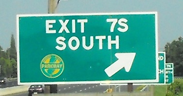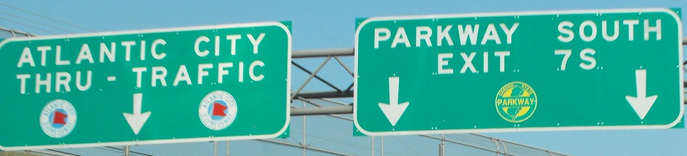 Eastbound again, with the last photo courtesy John P. Nasiatka and coming to me via Doug Kerr. Notice the progression from two, to one, to zero Parkway shields, and from zero, to one, to three, to as many as four destinations. Except for the overall square shape, also notice that these signs have nothing in common. Nada. Zip. The first sign loves ampersands and has a medium font. The second photo's sign has no exit tabs, an extra hyphen, and seems to have switched its shields and arrows - there are two through lanes here! In the third photo, we come up to off-center, off-font badness that doesn't match the exit tab or even itself, and now the hyphen has invaded that top tab! Then lose the exit tab altogether. The final sign isn't any better, but at least drops the hyphen. And look, its exit tab is on the right, where it belongs, for once!