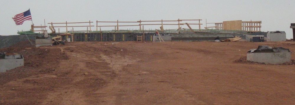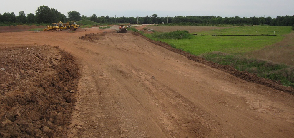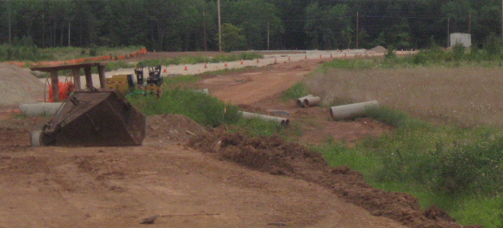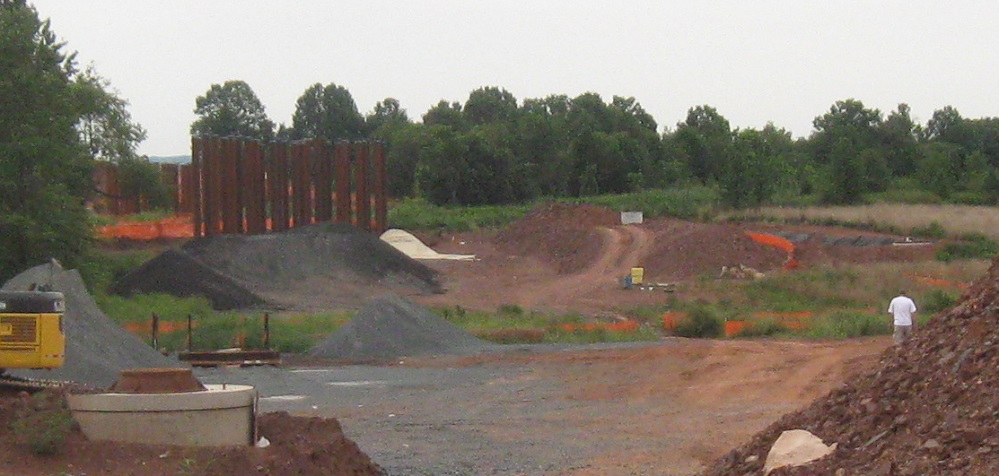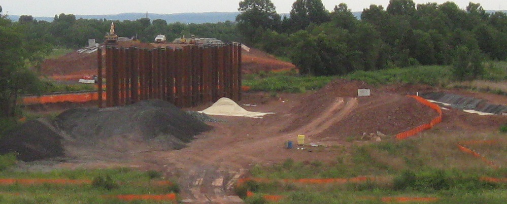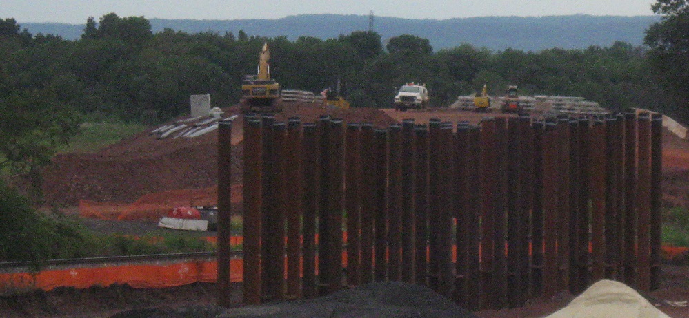 Looking farther north at the future railroad overpass. Dirt is for the embankment, the tall steel piles are for the abutment.