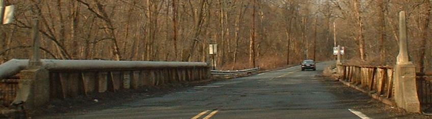 The nearly 80-year-old bridge on Passaic Avenue, connecting Chatham in Morris County and Millburn in Essex County (and ultimately Livingston, since this part of Millburn is just woods). As you can see, it's in pretty terrible shape, though it's still horizontal.