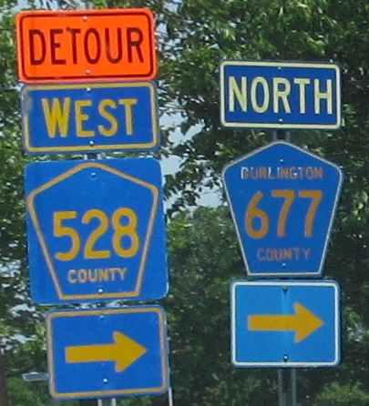 CR 677 NB has a very brief concurrency with CR 528. The first photo is at Stelle Rd. below a sign warning of a detour in 1500 feet, even though the CR 528 junction is 3,000 feet ahead and the detour doesn't begin until the second photo. I followed it as far as Crosswicks but I'm not sure how traffic was asked to get back to 528. The lack of county name makes sense for shields that may be patched and reused elsewhere, but I can't forgive the non-cutouts.