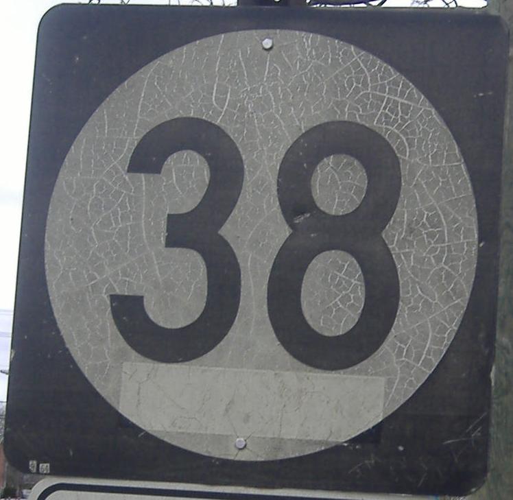 That would be EAST 38 to the left. The shield was clearly right in 1964 (September says the date, a practice long abandoned by NJDOT), and I bet it had a proper directional banner with it back then. It was also on CR 541 then, but now it's on CR 691 SB (right by the previous sign). Click for closeup of the cracked but not yet peeling shield, part of which was preserved by a rogue sticker that apparently saw many years of service.