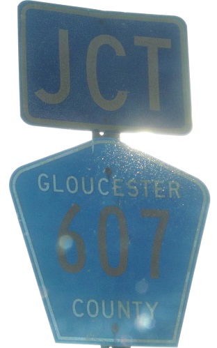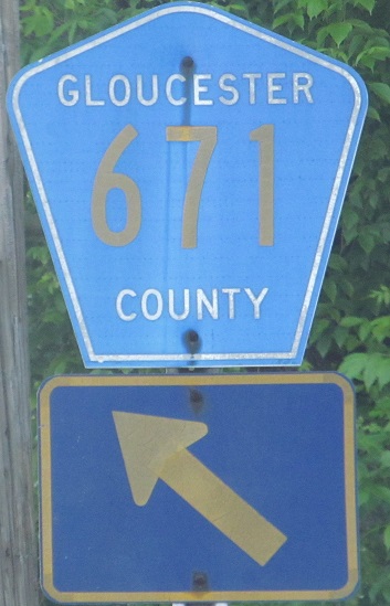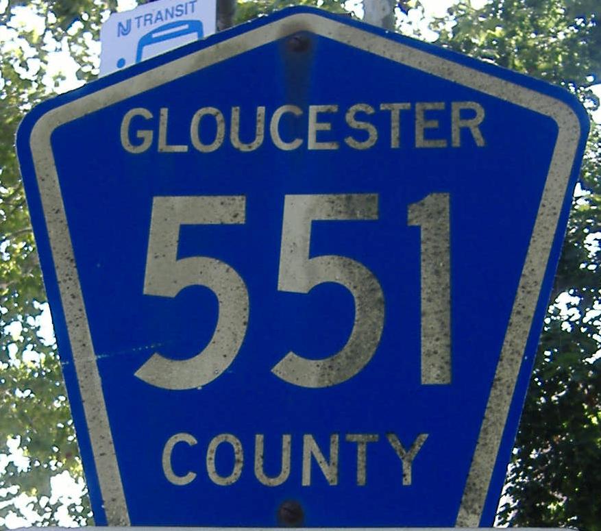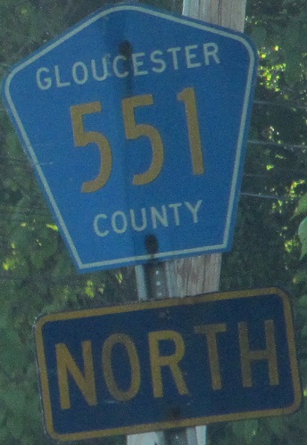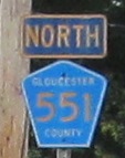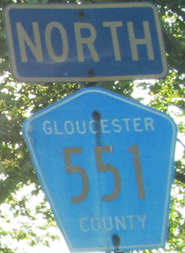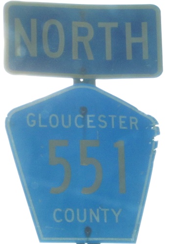 Not only is the number 5 patched on this shield, but the county NAME is too! I hope I hope I hope that Gloucester borrowed this shield that stands just north of Center Square Rd. from another county, as opposed to misspelled its own name. It also borrowed the east-west directions from northern Salem County, but the road should always be north-south (and this would then be NORTH 551, assuming the county put the North plate on the correct side of the shield).
