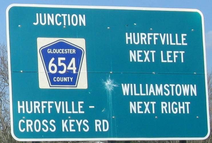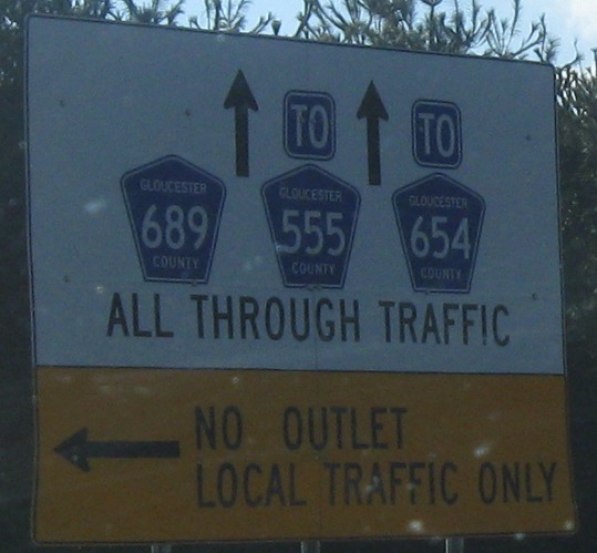 More unique signage SB, starting at the beginning of the bypass and old CR 689. Both ends of 689 were cut off at the old six-way intersection in the middle of Cross Keys, making it a more normal (and safer) 4-way. Since old CR 689 is now just residential streets, this isn't the worst thing, and both legs retain access to non-bypass roads (though northern leg traffic would have to go through a movie theater parking lot).
