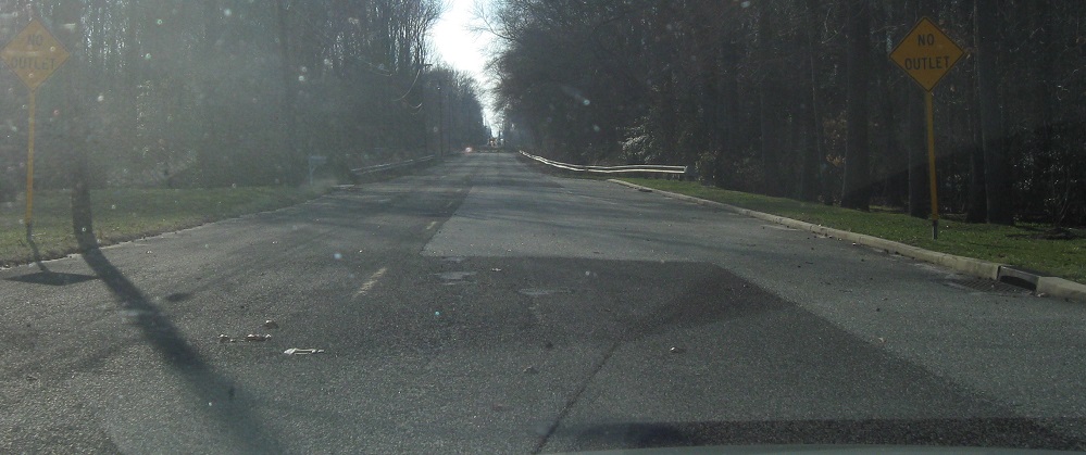 Coming back north (I could have also headed west on a cul-de-sac extension back to the bypass), I am rewarded with old signs from before this road was closed off and a remnant of the old connection to the six-way intersection.