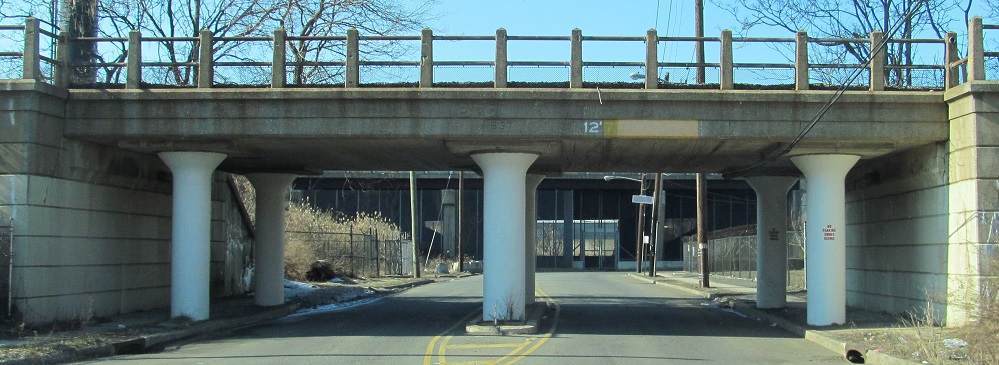 Speaking of the freight line that parallels the Turnpike, here's Jersey St. heading northwest through Elizabethport from 3rd St., coming under the freight line that was grade separated (here) in 1937 and then the Turnpike beyond it, the two forming a long, dark tunnel. The line was only separated through the Elizabethport neighborhood; there still is a grade crossing of what at least now is a private oil refinery road to the south.