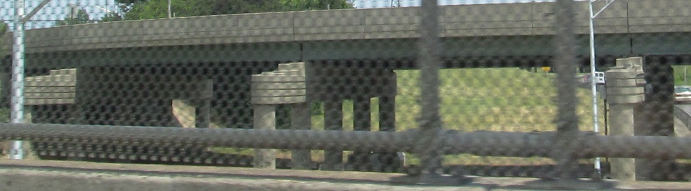 The ramp from I-278 WB to the Turnpike is 2 lanes, but the bridge piers are wide enough for 3 lanes, looking east from Brunswick Ave. The extra lane would have been the merge from NJ 81 SB.