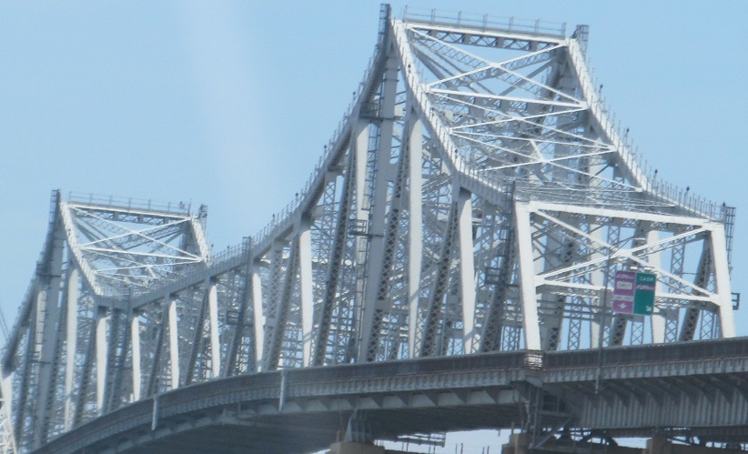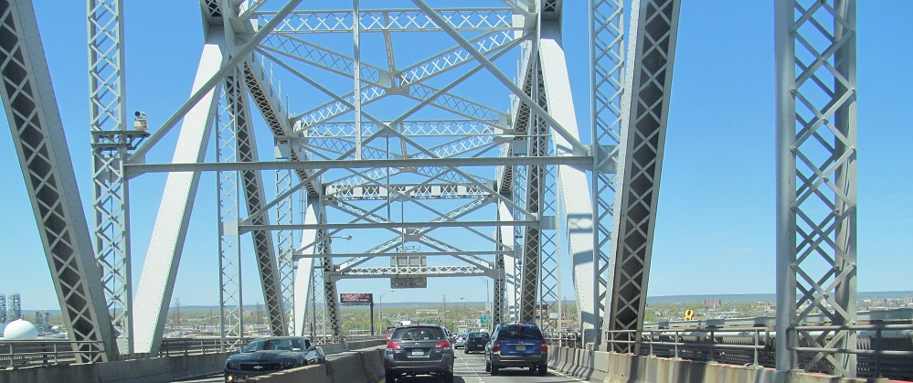 The Goethals Bridge as seen from the NJ Turnpike and from Newark Airport, with the Immaculate Heart of Mary and St. Patrick Church at left.
