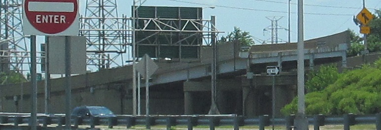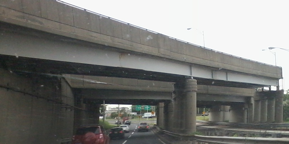 A more recent aerial view gives you the eastern end of the highway with US 1-9 to the left, the Park Ave. bridge to the right, and a U-turn in the center. Say what? That's new. Well it's already dead, as it was only put in place for ramp traffic detoured by Interchange 2 work, and you don't want left-side exits and entrances if you can help it.