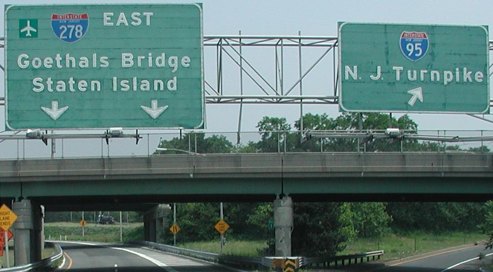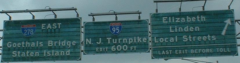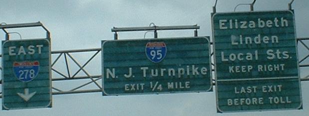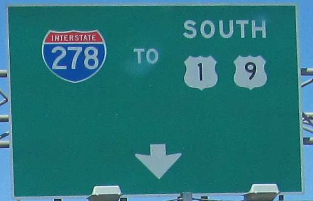 You think that was old - look at these! The second sign is just here for comedic value (note the same width on the 2di and 3di shields and the inconsistent font on US 1-9), so I won't comment on it further. The first photo is courtesy John Krakoff, the last one is courtesy Doug Kerr, and both are examples of former trapezoidal Port Authority signage that has been replaced. In the last photo, you can see both on the foreground BGS and the background ground-mounted BGS that shields have been removed. It looks like the original I-278 shield just been moved up, with the US 1-9 replaced with a still-quite-old patch; it doesn't seem like the leftmost shield was circular, which would imply an NJ 439. It looks like it had I-278 in one lane and US 1-9 in the other, possibly with a WEST 439 above (which would now be underneath the patch). The background sign probably replaced 1 and 9 shields with a NORTH 1 9 patch, indicative of I-278 being tied into US 1-9 SB instead of ending right here at the Turnpike, but it could just have been a simple shield replacement with no changed text. Note the trapezoidal shape from the Port Authority, indicative of their age.