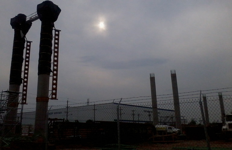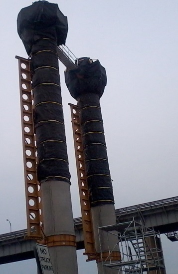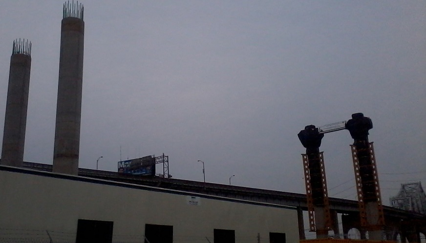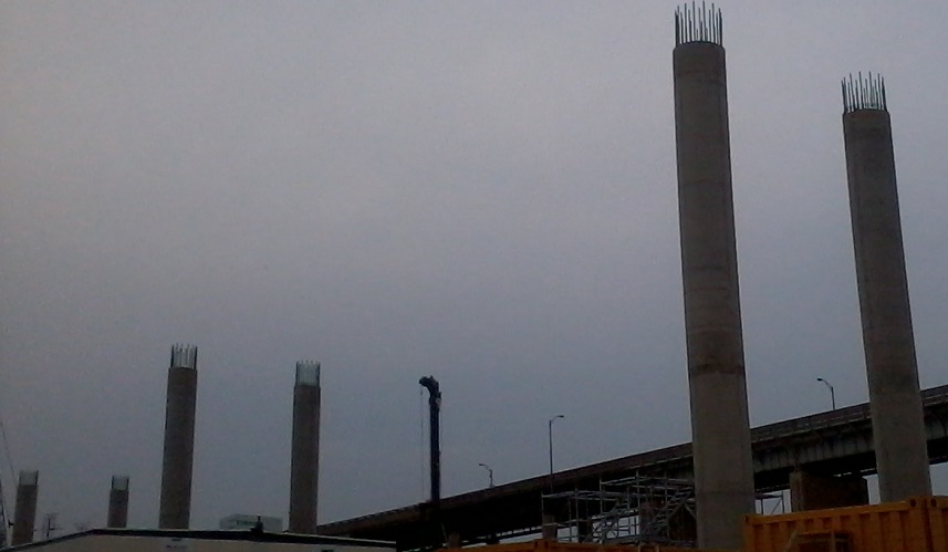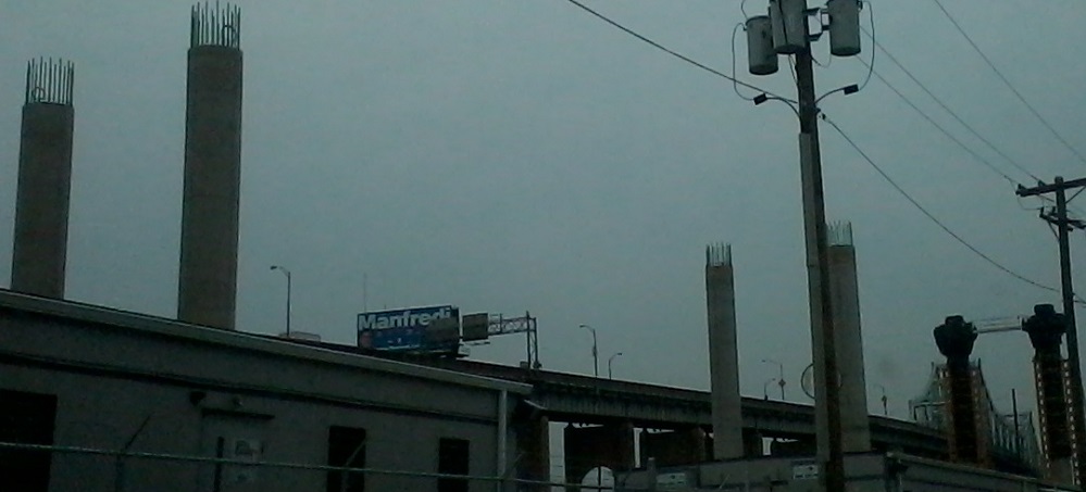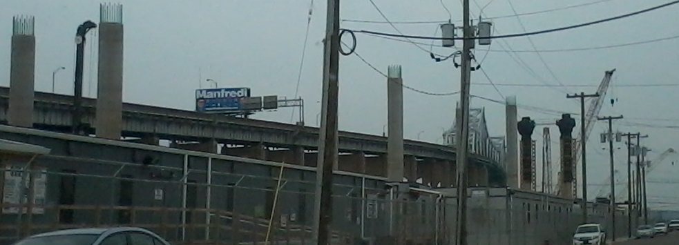The start of construction for the Goethals Bridge replacement, following Bayway Ave. WB in 2014-2015. The new piers are going in south of the current bridge.
