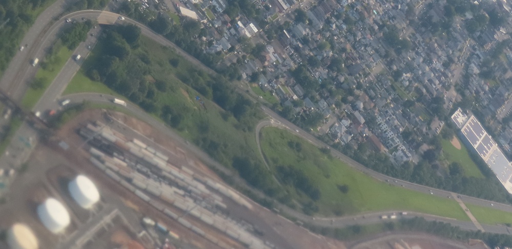 The wide median at US 1-9, where the freeway was intended to continue straight westward, and then an aerial view that shows the whole missing freeway from east to west. I-278 was intended to have a mainline freeway continuing through the middle of I-95 and NJ 439, with the outer roadways then functioning as a C-D system to US 1-9. You can see the Park Ave. bridge halfway along.
