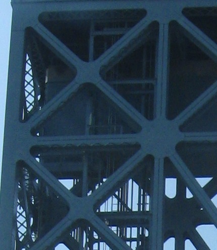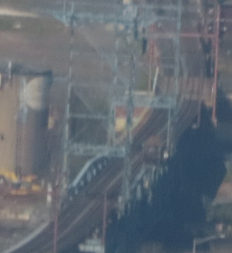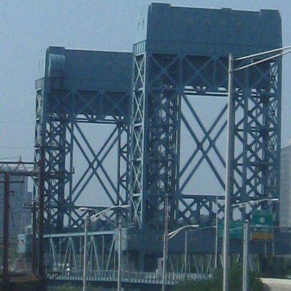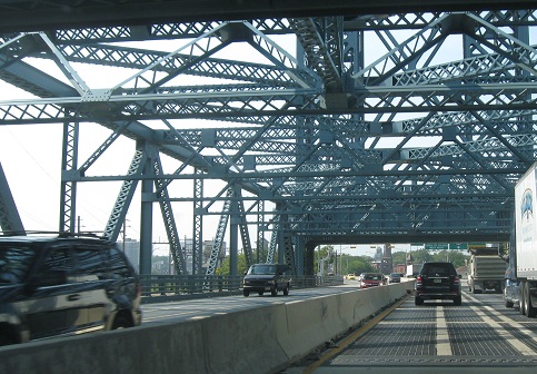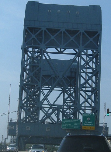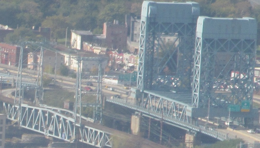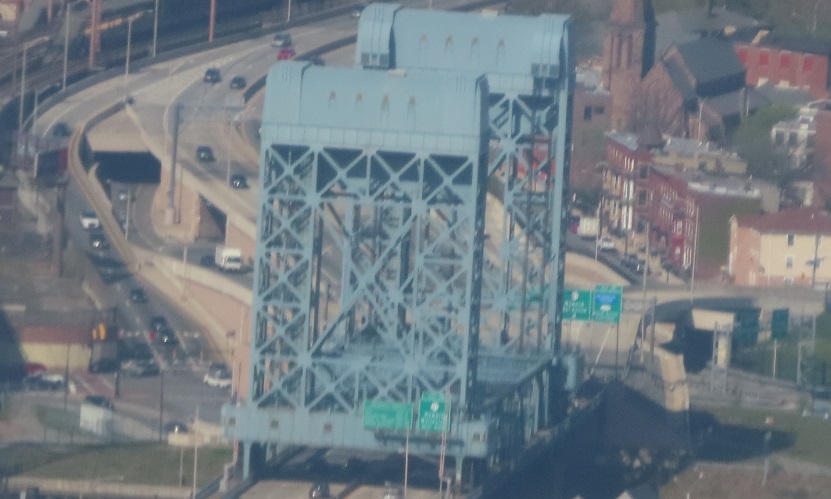 With my airplane landing at Newark Airport, a westward look at the bridge is almost level with the road. Bonus photo of the pony truss carrying the railroad just to the south, technically a rotating draw span that opens about as often as I-280 (almost never anymore). Compared to the photos above, you can see that Exit 15 is now a single ramp, and in fact since those old photos the entire interchange was redone so all 8 movements are present.