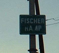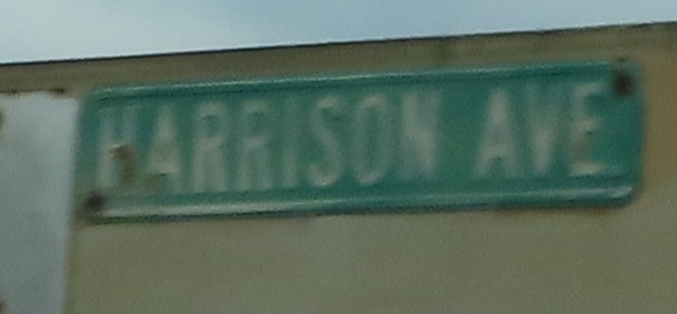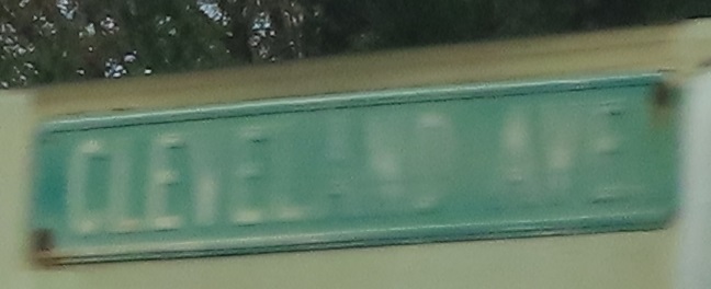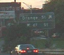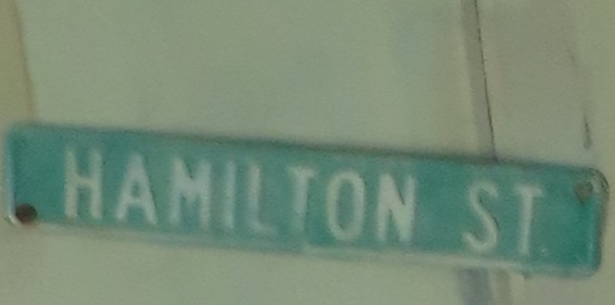 Within that span there are embossed street signs on almost every overpass, likely dating to the construction of the freeway in the late 1970s. The ones missing have fallen off, which Hamilton St. is in danger of doing here (photo rotated 90 degrees, top right sign corner swinging free).