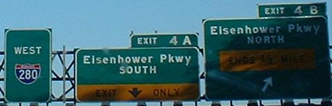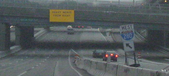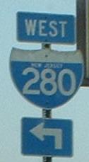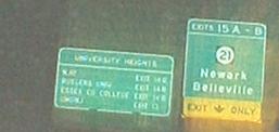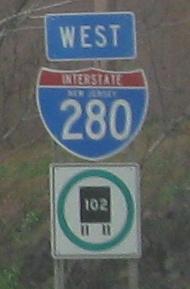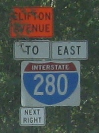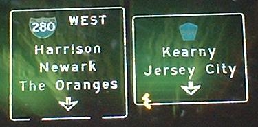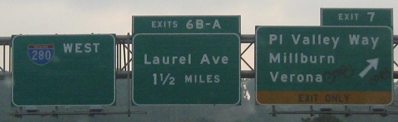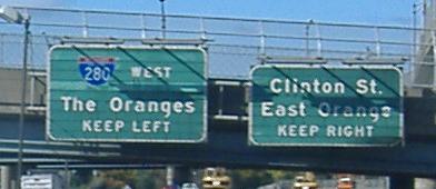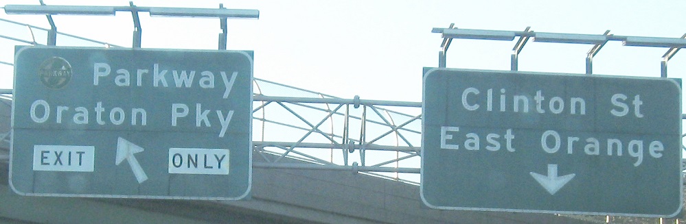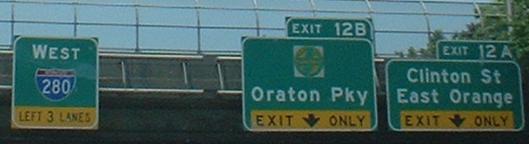 Signs on the Exit 12 ramps; the second one is now obsolete, as ongoing ramp reconstruction from the GSP has resulted in a clean split of that ramp instead of a merge with the Exit 12A (Clinton St.) roadway. In other words, traffic not paying attention that keeps right after the Exit 13 merge will have to exit to the frontage road, and no longer gets a chance to be saved and re-enter the freeway. (Both lanes of what was I-280 WB exit at Exit 12A-B, while the three lanes added by what would have been NJ 75 at Exit 13 continue as the I-280 mainline. The half mile of weaving is, shall we say, fun.)
