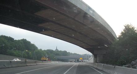 In July 2008, the new onramp from the GSP is open and the old one (the pile of rocks in the right foreground) is on its way down. Hopefully the non-cutout construction shields go with it. Having two lanes to merge will greatly improve traffic in this direction, but the worst traffic heading onto the GSP SB gets no help for now. There are more cosntruction photos on the Exit 12 page, which you can see via the big link below.