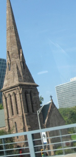 Sights from the former NJ 58, past the House of Prayer Episcopal Church (the most recognizable landmark from I-280) to the ramp for Exit 13, with a sign dating from the construction of I-280. It has been replaced, so this is the best I can do.
