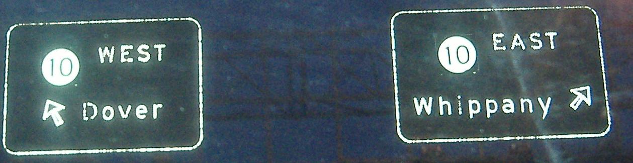 The slightly sun-adjusted nonreflective signs are at the gore of the exit ramp, and unlike most of the signage on I-287, they're nonreflective. Click on either photo to see them together at nighttime. It was probably just missed the last time signage crews came down 287, or maybe it was waiting for when NJ 10's old BGS's at 287 got replaced.