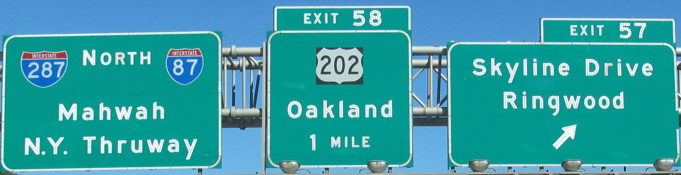 The 2nd/3rd photos are left/right on the same gantry and you then get another button-copy gore, a diagrammatic, and the beginning of NJ 208, framed by two scenic photos of the Ramapo Lake and Campgaw Mountain areas. In fact, NJ 208 originally ran northwest to Skyline Drive. I-287's originally preferred alignment took it well east of its current one, cutting through the NJ 23/US 202 multiplex instead of a few miles north (hence the really wide roadway on the multiplex just south of US 202's exit at Black Oak Ridge Road). It also would have intersected NJ 208 east of US 202, instead of absorbing the first two miles of the road. The new alignment, chosen for environmental and residential issues (people up here are RICH like you wouldn't believe), required extensive reconfiguration at Skyline Drive, and killed half of NJ 208's interchange with High Mountain Road while moving the other half of it. Go visit the NJ 208 page.
