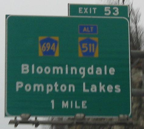Heading SB, we see yet another style of ALT banner, one that looks much better than the style just north of it at Exit 55. The shields are also refreshingly normal. CR's have both Alts and Spurs; this seems much more like a Spur to me, since Alt. CR 511 never rejoins its parent, but ends at US 202. After the scenic look at the Ramapo Lake area, the next BGS is really just about 1/4 mile from the exit, not 1/2 mile.