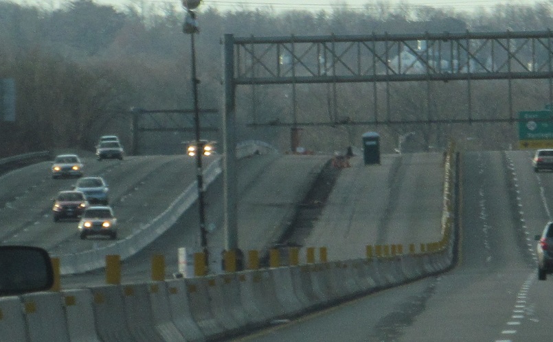 If that first sign looks a little odd to you, it's because it's so far north on the I-287 roadway that it's in New York, and that's standard NYSDOT signage. In the late '80's and early '90's, the overpass in the last photo, which is I-287 NB, was a ghost overpass, and the 287 SB split was barricaded off.
