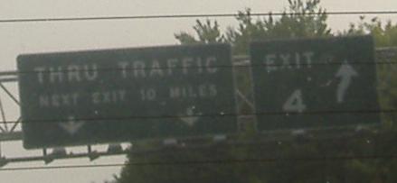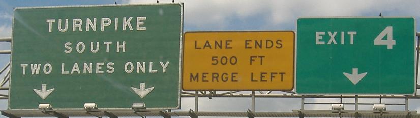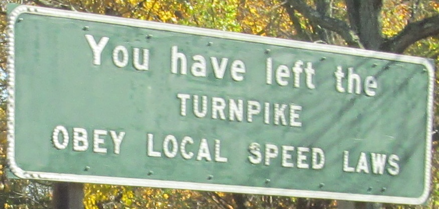 Notice the aversion to upper-case lettering. This sign is found whenever you exit the Turnpike, a friendly reminder that you're back in the real world again (and totally unnecessary - do they have to tell you to obey laws?). This exact sign is at Exit 4.
