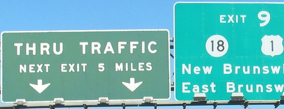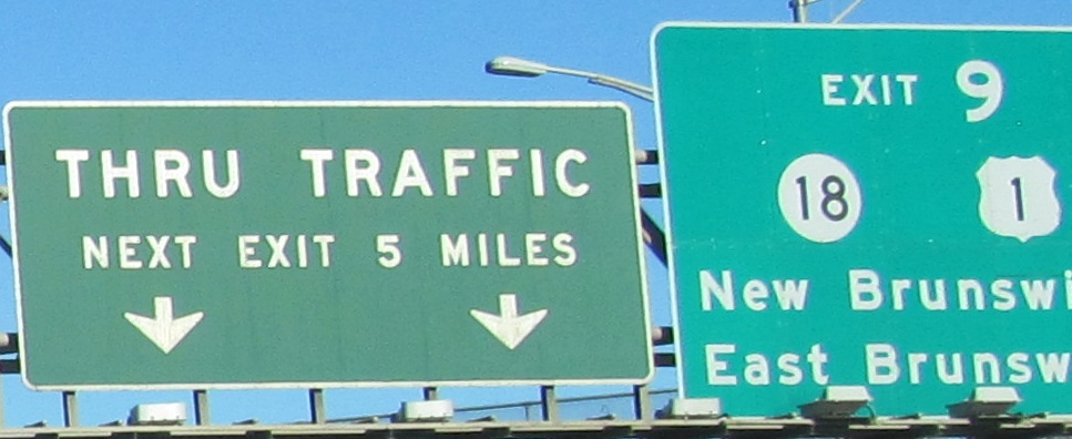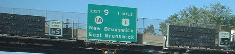 The 3rd photo is on the Inner Roadway and the last 2 photos are over the Outer. Also check out the wide NJ 18 font (Series E?) on the advance sign, and the Turnpike's smallest mainline BGS in the next photo after that. Now's as good a time as any to mention that all exit gores on the Turnpike are elevated above the lanes, instead of sitting at the diverge point at eye level. I don't know why either.