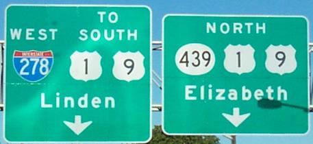 A problematic new assembly on the Exit 13 ramp, courtesy HNTB Corporation, and then an old shield on the same ramp. NORTH NJ 439 should lead TO US 1 US 9; they're not all multiplexed.