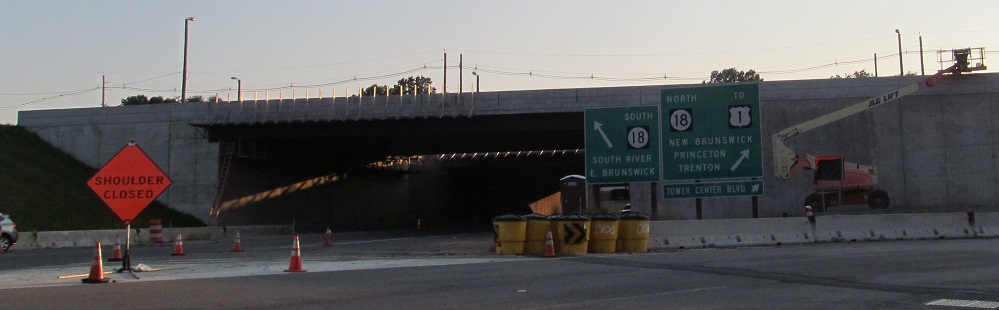 Off Exit 9, featuring 2014 construction to widen NJ 18 and the Turnpike ramps that pushed the highway mainline east toward the toll plaza.