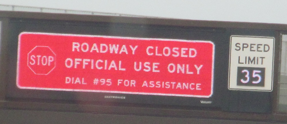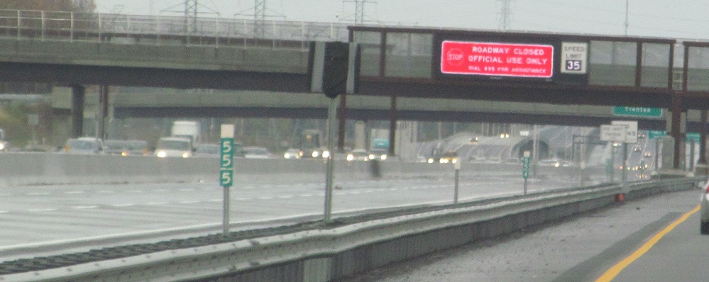 Leaving the Thomas Edison Service Area north of Exit 11, left and right sides, courtesy Lou Corsaro. I've seen "ROADWAY CLOSED," which the Turnpike Authority is just as likely to use in response to traffic as when the road is actually closed, but here they opt for a more honest approach.