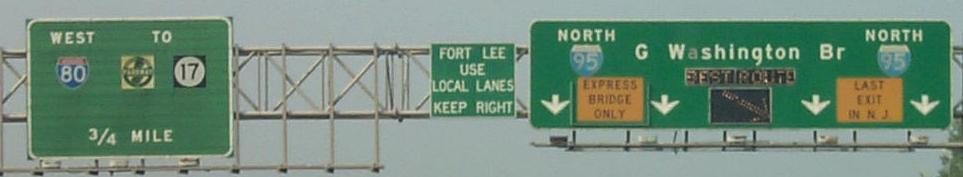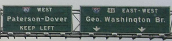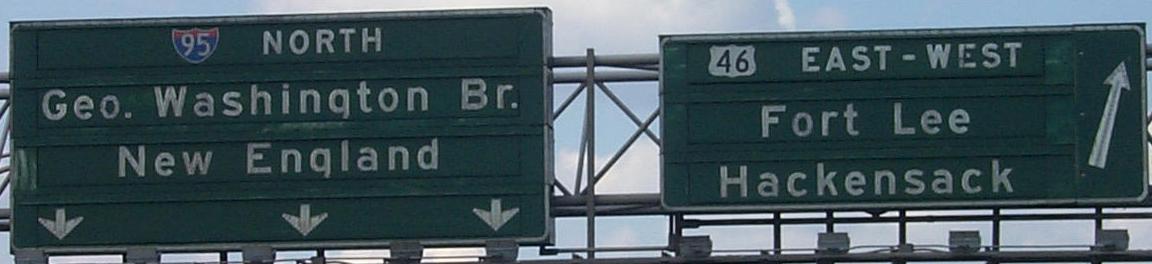 First photo is mine, third is courtesy Lou Corsaro, and the rest are courtesy HNTB Corporation. These mostly-defunct signs once were the NB progression leading to US 46, where the Turnpike once ended, meaning that six lanes of Turnpike traffic (really eight, but some would head west to I-80) was dumped into four lanes of US 46. That didn't work so well. The signage in the fourth photo is the more current version (this was taken before the panels were replaced in the left VMS - you can see the last bits of button copy still lingering and the duplication of the I-95 shield); click on it for an older version. The last photo, with the poppin' shields, was on the exit ramp; the extra room on the EAST US 46 sign doubtless was used to guide motorists to the George Washington Bridge when the Turnpike ended here. Yes, this sign was that old, and yet still functional to the end. There is still a remnant of the old end where the NB offramp to US 46 WB crosses 46 and loops around; the old SB onramp is still attached to the 46 overpass, though the rest of it has been demolished.