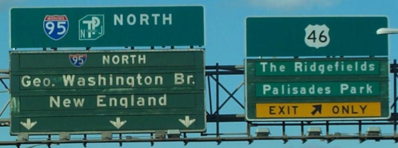 The replacement is ground-mounted, combines US 1 and 9, and shows the Palisades Parkway in a (white-background, incorrectly) shield, but still omits which directions these routes run. US 1-9 NB and 46 EB are straight ahead on I-95, so these should be North, West, South, West, and North, respectively.