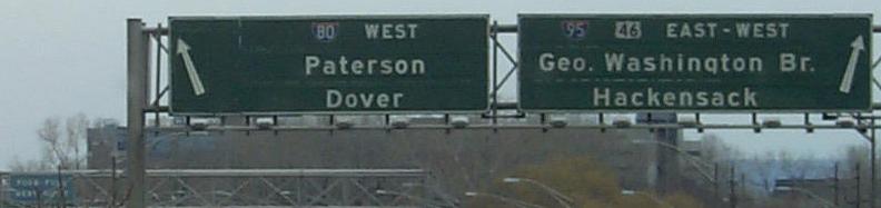 Two old signs, courtesy HNTB, both gone now. The first hung over I-95 NB, with the left BGS over the dedicated I-80 ramp (as in, you're stuck, so the sign was gratuitous), while the second was at the split in that ramp as the rest of 95 turns eastward.