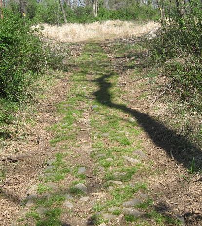 The Lenape Trail continues southward down Locust Ave., still with a good amount of the pavement that once carried through traffic from Roseland (Beaufort area) to Livingston. Where the old pavement isn't whole, it's at least rubblized.