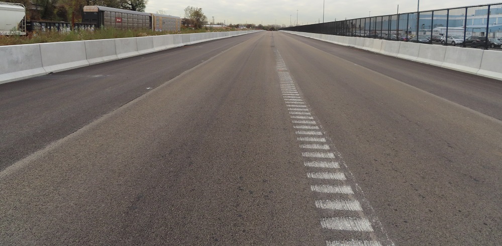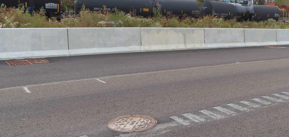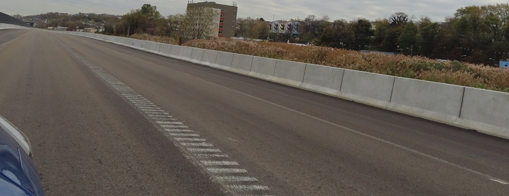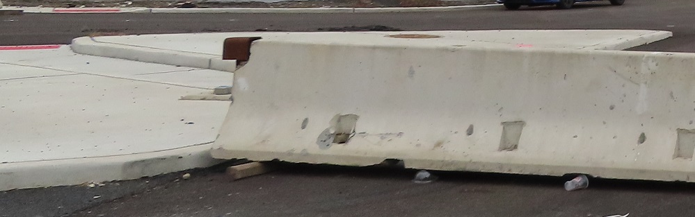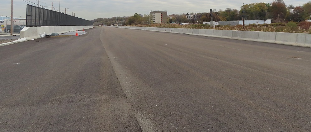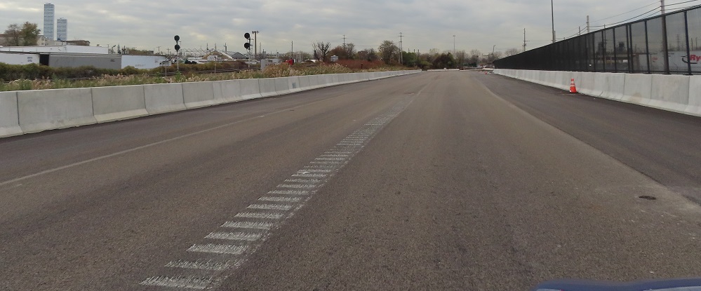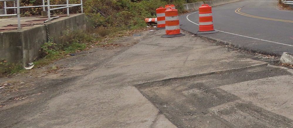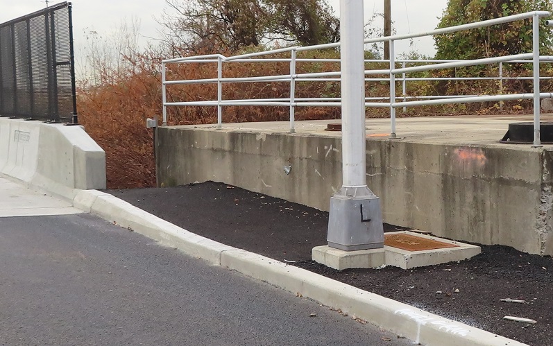A couple of other things I want to touch on before I give you the run of the road, both looking south. The first photo shows that the existing USPS driveway was shifted west to make room for New Road, resulting in a major parking lot redesign to maintain their facility. (Not to mention all the utility and drainage impacts that are part of civil engineering design.) I didn't want to intrude into US government property, so you get this view instead. The second photo shows an example of "adjacent work" not yet completed. The (2021 stamp) bridge has holes in the concrete to attach a guide rail, which is required to protect the bridge from a blunt vehicle impact. It would go in front of the light pole and then end somewhere upstream as determined in design.