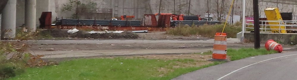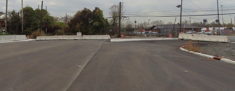 While we're up here, let's take a look at the north end of the USPS facility. The Secaucus Rd. driveway comes south in a long S curve and intersects this former paved area that appears to lead right into it. Well, before construction started, the USPS driveway followed this very pavement north under Secaucus Rd. and then curved around onto Grand St. But New Road is now using Grand St. for its own connection, so to maintain a separate USPS driveway it was rerouted to the far side of the Grand St./CR 678 intersection, resulting in this piece becoming abandoned (and eventually torn to dirt). Fun fact: One of the design alternatives would have brought USPS traffic directly out to New Road instead of this reroute.