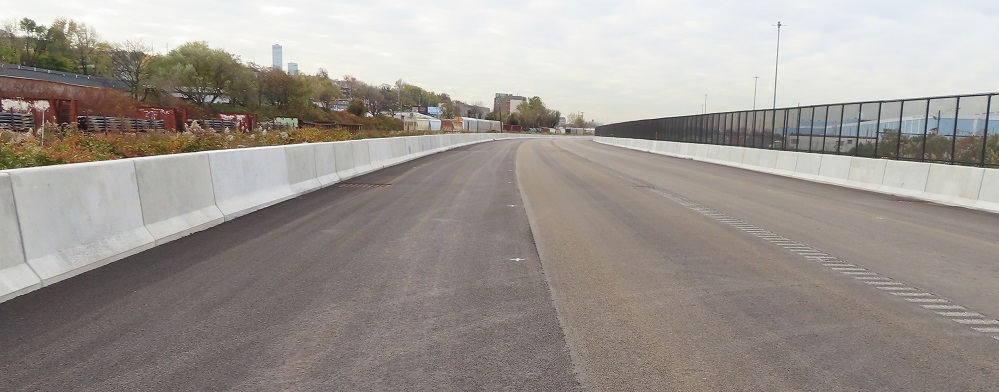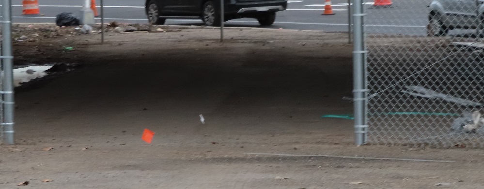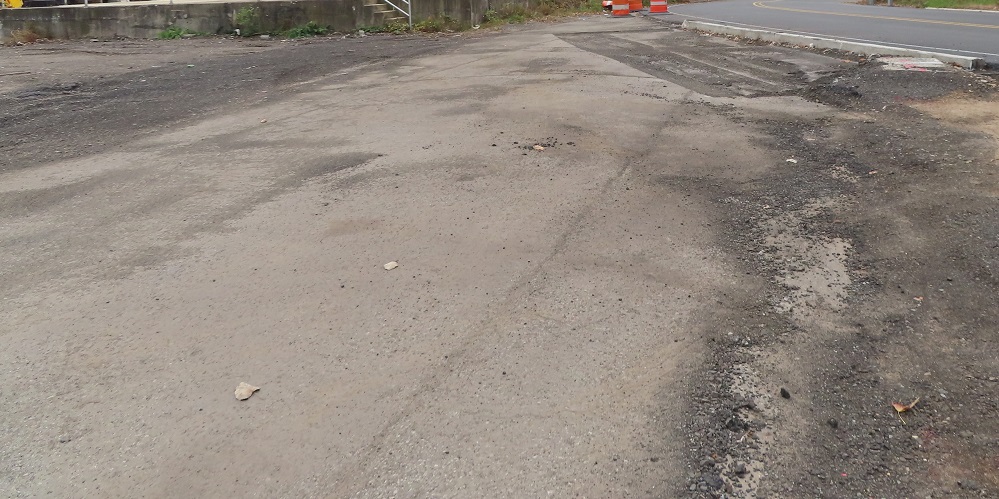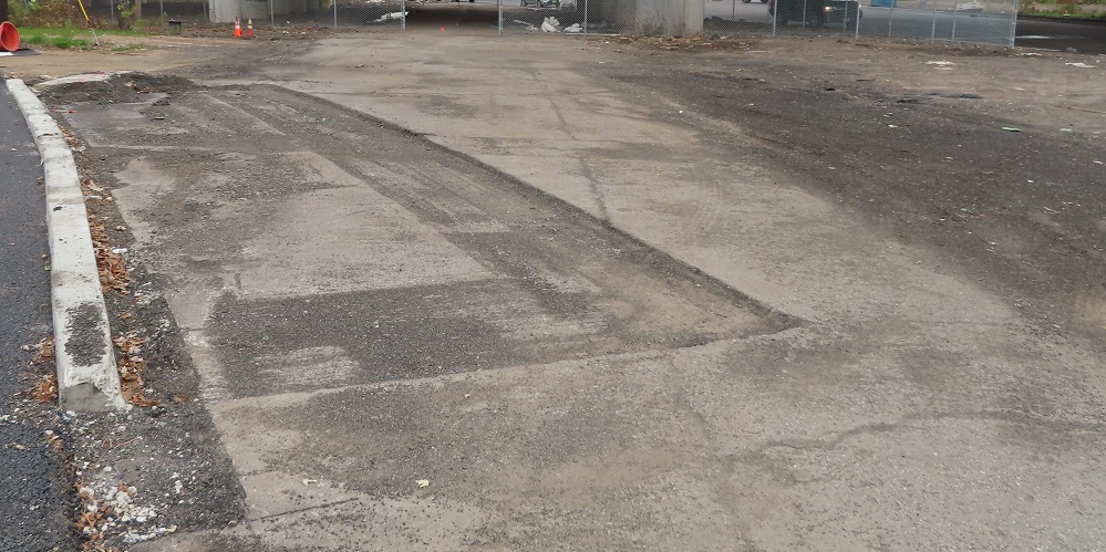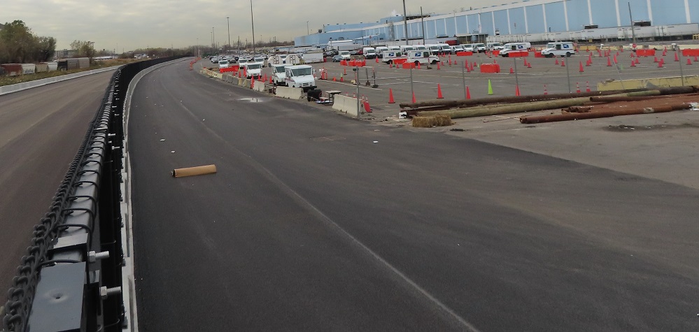 Heading back out of the USPS facility, with the old driveway straight ahead and the upgrades to Grand St. visible behind the gate.