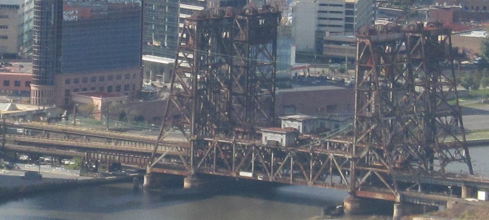 Looking down at the 1935 Dock Bridge from the former PA (Port Authority) offices at 2 Gateway, then two views of the old PA (Pennsylvania) Railroad bridge from the air.