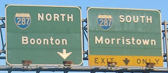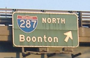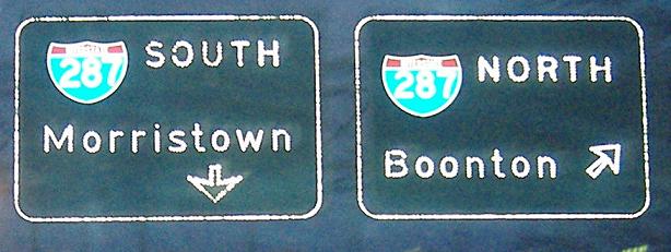 On EB NJ 10 at I-287. The EB-NB ramp is the only loop of the interchange, which was designed so that there are no weaves anywhere. A lot of ramps, like SB-EB, are a lot longer than they need to be, because they hook way around the interchange and come all the way back. These signs all probably date from the designation of the freeway as 287, which would have happened as soon as it was long enough to be an Interstate, probably in 1967. The only intact shields at the interchange are on that first sign, though it is possible the others were just patched on top without taking down the other 2di-width originals.