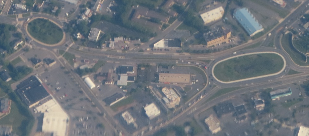To help introduce the remaining photos, I'll give you this aerial view of the east end of NJ 12, looking north. NJ 12 comes in from the west as a two-lane road (from a third circle not shown here - CR 523) and circles with CR 611/Main St., with Reaville Rd. spurring off to the southeast. It then becomes a four-lane divided highway for a short distance but quickly ends at Flemington Circle, where NJ 31 and US 202 come together from the north (31, top right) and northeast (202, right center) to head southwest. Despite being modified to include a northbound bypass of the circle proper, the racetrack on the right is still a true circle with traffic in the circle required to yield to US 202 SB as it enters, whereas the one on the left is now a roundabout with all entering traffic yielding. I would love if Flemington Circle got the Somerville Circle treatment with a US 202 flyover (at least for SB traffic). NJ 31 was once slated for a western Flemington bypass to take some traffic away, but that's dead.