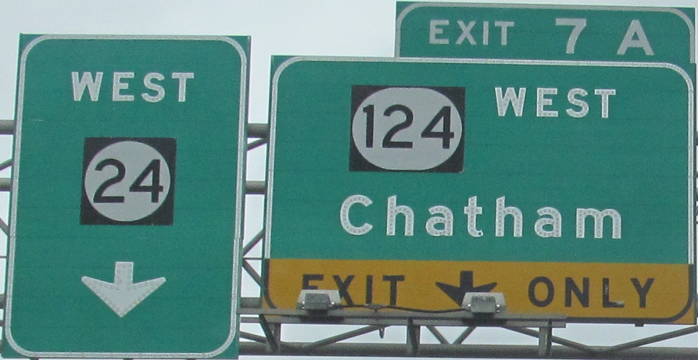 WB on NJ 124 just before it leaves the side of NJ 24 WB. It also is immediately after 24 West's Exit 7C for JFK Parkway, but before 7C has merged with the NJ 124 frontage road. This and the JFK sign date from the opening of this interchange, although it is possible this sign has an extra year or two of age (as JFK Parkway wasn't completed exactly at the same time as the first section of NJ 24).