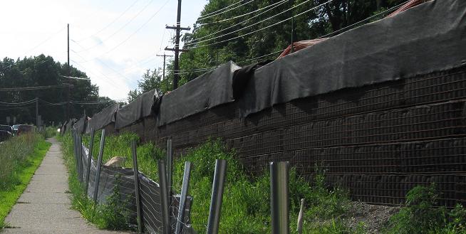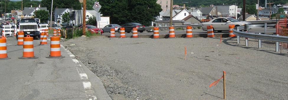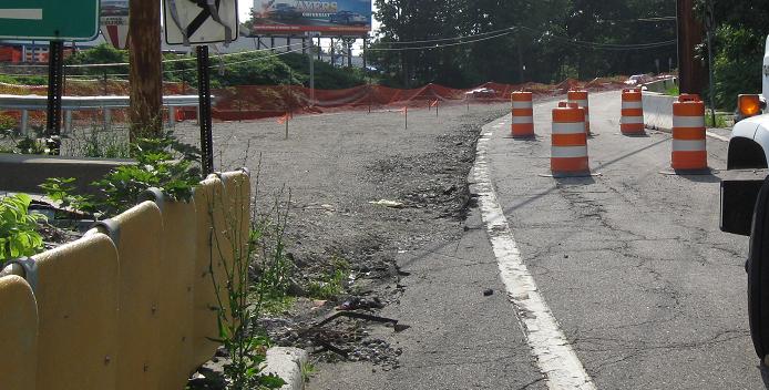 Old NJ 15, Clinton Ave., at its new dead-end. There wasn't a lot of effort to remove striping or, at this point, even give any shape to the eventual cul-de-sac. There will be a new bulb and appropriate curb at some point, but right now there's little to prevent someone stupid from crashing into the modular retaining wall.