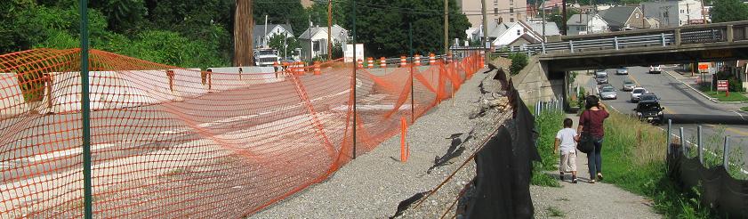These were on NJ 15 SB approaching and then at US 46, one of those places where you can make a right turn to go from SB to EB. Until the new construction, 15 crossed under 46 just west of the town of Dover, where the only ramp was WB-NB, then ran parallel to it a block south for awhile on Clinton Street. Finally giving that up, 15 SB curved to the north, where you would once see the first sign (in fact, ever since the 1930s), made a left turn on Bergen Street (after passing Warren, Sussex, Morris, and Essex - notice a pattern?), and ended at 46. Going straight from there brings you to I-80 at Exit 35, as you see by the second sign, just a mile east of 80's junction with 15 at Exit 34. In other words, by following NJ 15 SB you could make a complete loop. This has changed, as NJ 15 now comes to a proper grade intersection with US 46 at the old overpass; the river/railroad/15 overpass was overdue to be rebuilt anyway. Clinton Avenue now dead-ends just before reaching 46, because there's not enough room to bring it up the hill to 46 (whereas 15 is coming down a hill the other direction, and thus can just be smoothed out to level). At least the oldest sign (the first) has been preserved at the Whippany Railway Museum. The rest of this page is mostly photos of construction for the new 15.