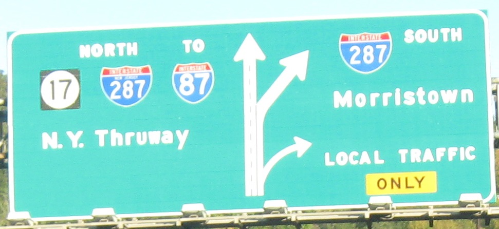 The opening of I-287 through northern NJ resulted in a massive reconfiguration of the NJ 17/NY 17/I-287 interchange - I-287 is now a through route, and NY 17 was taken off the Hillburn Bypass and put onto the Thruway (I-87) for one exit. The 17 NB-287 SB ramp takes a loop that just grazes the NY border, which once was just an NJ 17 turnaround to stay in the state (or to get you SB from the small office complex just to the east). Notice that only one of the I-287 shields has the NJ state name, and it's for the NB direction that's about to enter New York.
