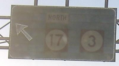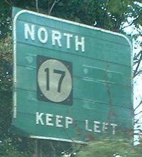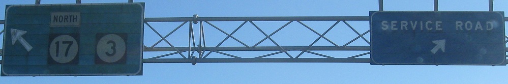 Starting off at the beginning of the divided highway, where NJ 17 curves north from the old NJ 3 alignment to interchange with the NJ 3 freeway. The missing shield on the first sign was a 3. Notice the white "NORTH" on the NB BGS - I haven't seen this style before, but clearly it hasn't been used in a long time; if you go way to the bottom of the page you'll see screwy SB BGS's as well. Click on this link to see a closer view of that BGS with the white NORTH, and click on this other link to see the other (blue) sign from the second photo up close. Follow the NJ 3 link at the bottom of this page for more pictures from the service road (which was created with the interchange).