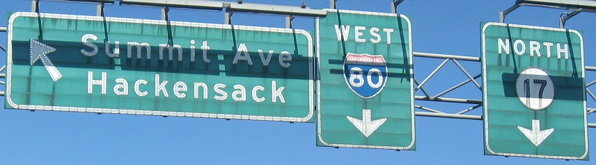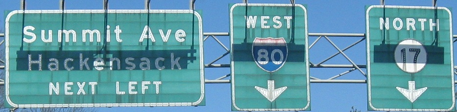 This is very close to the town of Teterboro, which is close to the smallest in NJ in both size and population. Its entirety is about 20 people who work at the eponymous airport. Due to the layout of the 17-80 interchange, traffic going NB-EB must use a surface connection (or EB-NB, or in fact SB-WB or WB-SB). I-80 was constructed straight through a half-mile section of NJ 17, so NB 17 runs right alongside WB 80 and SB 17 is next to EB 80 - unfortunately there's no easy on-off for the roadside businesses on the south (original roadway) side, though smart travelers can use the previous exit and still get to SB 17. Go to the I-80 page for more, link at bottom of page.