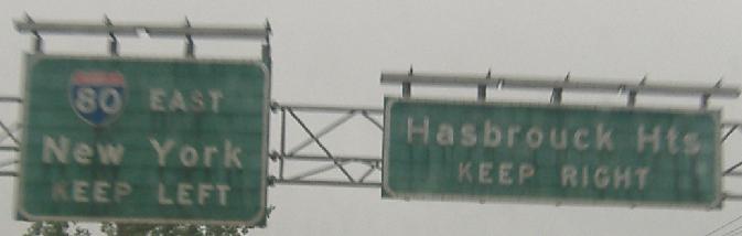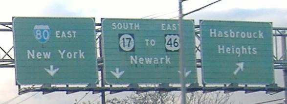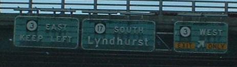 Ending at NJ 3 on the half-expressway half-Jersey freeway part of NJ 17, you see some mini-sized BGS's (MGS's? Medium Green Signs...) at 3 WB. NJ 3 EB steals half of NJ 17 SB, with two lanes going each way out of three SB lanes (which makes sense, since more traffic is going to the Lincoln Tunnel than south toward Newark). South of here, NJ 17 makes a sudden 180 degree loop to the west and north, then a 90 degree turn back west, and parallels NJ 3 for a mile before following Ridge Road until 17 ends at NJ 7. There are all the elements of a cloverleaf to this interchange, although slightly screwed up - this would have been a perfect cloverleaf if NJ 17 had been extended as a freeway to the NJ Turnpike Westerly Alignment, but that was deemed unnecessary. Several millions of dollars in interchange and NJ 3 bridge improvements later, it is that much more unlikely there will be an Exit 16AW. (Bill Mitchell says some plans would have taken NJ 17 as far south as Exit 15W and I-280.)