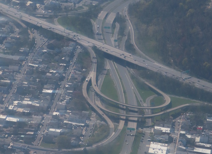 Let's start with an aerial photo as NJ 19 takes shape out of Paterson. I-80 bends west around Garret Mountain to the right and NJ 19 stays on the east side of the last hills before the Hudson River. Because NJ 19 is rising vertically from bottom to top of the photo, I-80 WB needed some very long ramps to "chase the grade". Perhaps for that reason, this interchange was incomplete well into the 1980s, with the WB offramp just a midair stub and the freeway abruptly ending at Grand St. (the first cross street you can see here). I-80 WB had to use Exit 57C and circle around local streets to get up from Grand St. to NJ 19, and NJ 19 NB traffic used a median U-turn to get to I-80 WB.